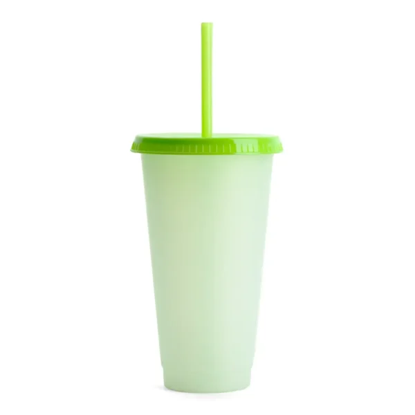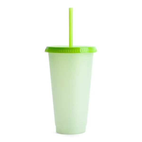 Vaso de plástico con tapa de presión y popote. El cuerpo del vaso cambia al color de la tapa al agregar agua fría